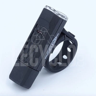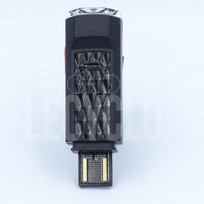Ce phare avant se fixe sur le guidon via un collier en caoutchouc ajustable de 25.4 à 31.8 mm de diamètre. Il fonctionne avec une batterie 3.7V 80 mAh et se recharge par USB via un ordinateur, une prise secteur ou une batterie USB externe.