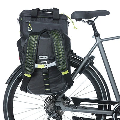 Comment savoir si ma sacoche est compatible ? Logiquement, toutes les sacoches latérales à crochets de la marque Basil (avec système Hook-On) s’adaptent sur les rails. De nombreuses combinaisons sacoches/paniers s’offrent à vous, agrandissant ainsi grandement votre capacité de chargement. À savoir que la charge maximale est de 10 kilos (poids pour les rails uniquement). Vous pouvez, par exemple, y installer :