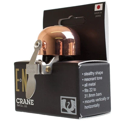 Disposant de belles finitions, la sonnette E-ne Crane produit un son puissant et clair qui permet d’annoncer efficacement sa position à vélo. Sa couleur cuivre donne un look élégant et ancien à la bicyclette. Cette sonnette s’installe sur le cintre du vélo en position horizontale ou verticale. Elle se fixe via une bande en acier inoxydable renforcée en vinyle pour ne pas abîmer le guidon. Elle est compatible avec les cintres de diamètre compris entre 22.2 et 31.8 mm.
